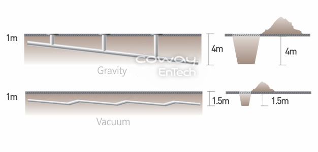 While it is maintained vacuum inside the pipes, when the vacuum valve is opened and air flows in, sewage is collected using the pressure difference with the atmosphere.